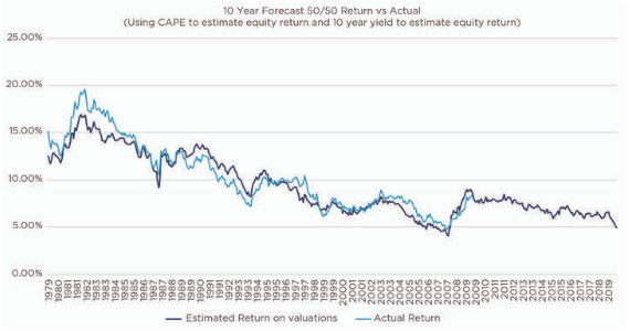 The combined effect in our view is that the expected return on a simple 50/50 stocks and bonds portfolio is likely to be less than 5% p.a. over the next 10 years1. The only compensation accompanying these lower returns is that this environment is likely to produce lower levels of inflation.