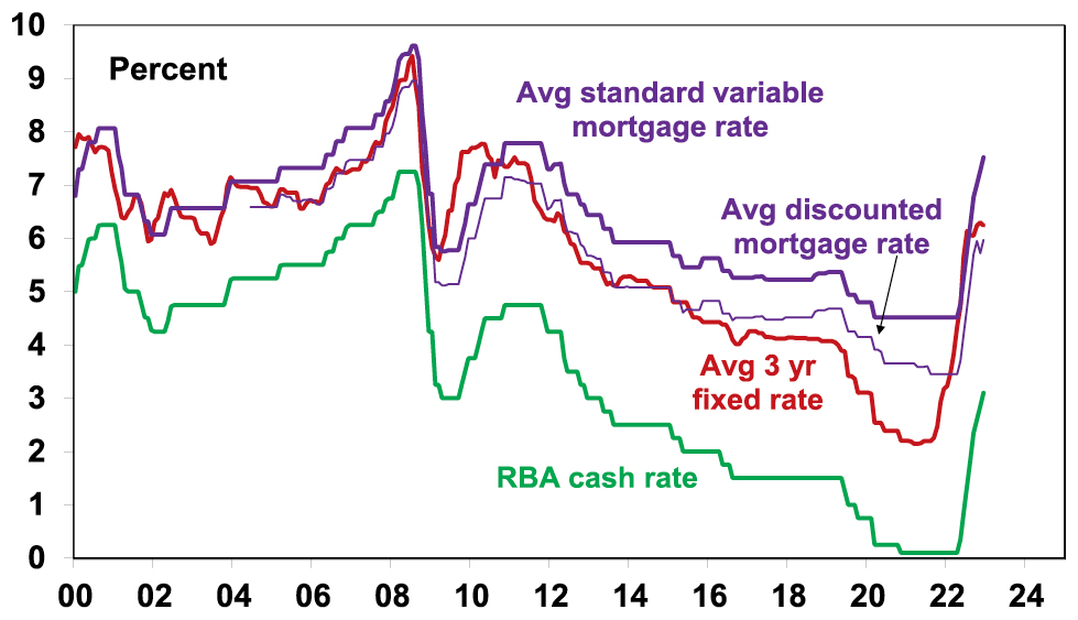 The RBA raised its cash rate by another 0.25% taking it to 3.35%. This is the ninth consecutive rate hike in a row over ten months totalling 325 basis points and exceeds the 2002-2008 tightening cycle (of 300 basis points over 71 months) making it the biggest tightening cycle since the 1980s. Prior to 1990 the RBA cash rate was not officially announced, and short-term rates were very volatile. In the period January 1988 to November 1989 the overnight cash rate rose from 10.6% to 18.2% but mortgage rates were more regulated then and “only” rose from 13.5% to 17%.